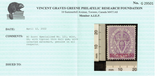 British Columbia #12i Mint Fine+ With Inverted Watermark **With Cert.**