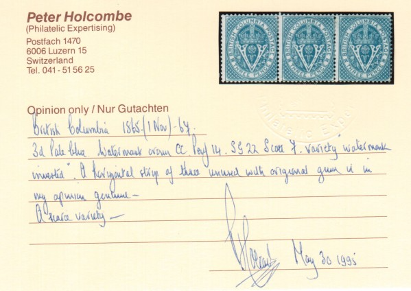 British Columbia #7i Mint Inverted Watermark Strip Of Three, Full Original Gum, Hinged, With Certificate. Read more
