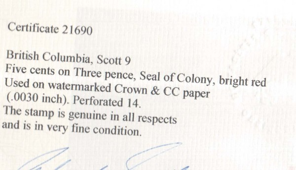 British Columbia #9 VF Used **With Certificate**