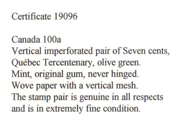 Canada #100a Extra Fine, Never Hinged Imperforate Pair, With Certificate. Catalog: $2500.00++ Read more