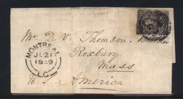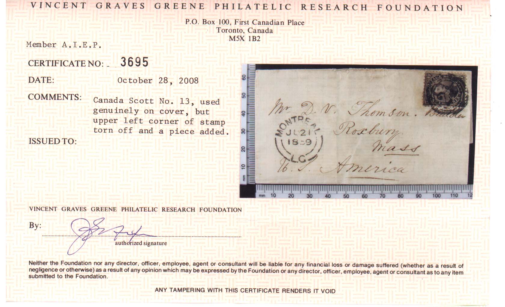 Canada #13 Used on cover, very attractive showpiece, tiny cover to USA, stamp is repaired at upper left, comes with... Read more