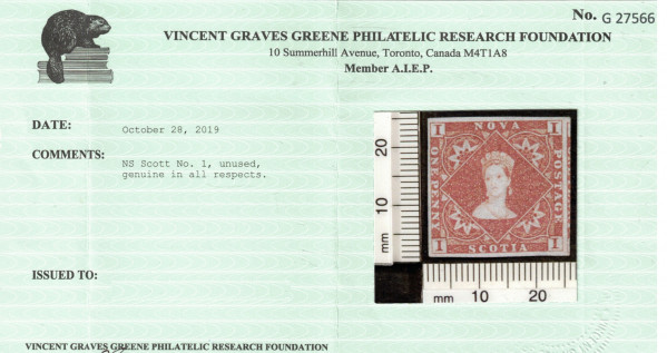 Nova Scotia #1 Extra Fine Mint Unused (No Gum), With Certificate. Read more