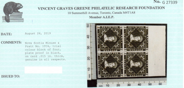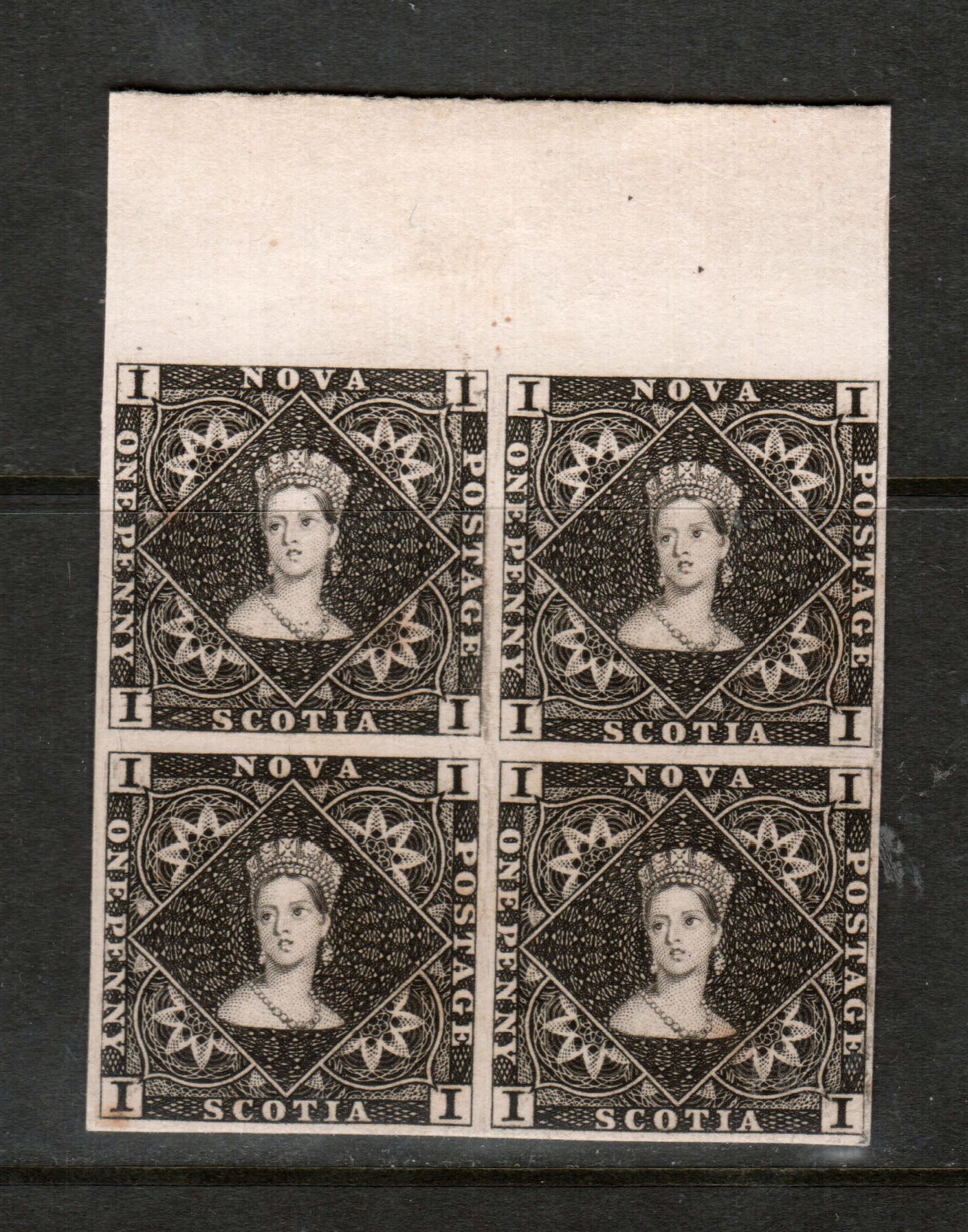 Nova Scotia #1P Very Fine Plate Proof Block In Black On Thin Card With Sheet Margin At Top, With Certificate. Read more