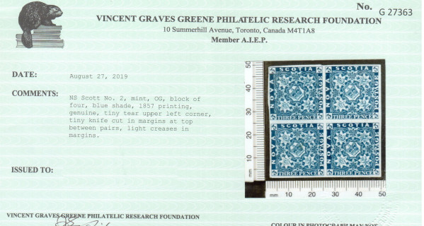 Nova Scotia #2 VF Mint Block **With Certificate**