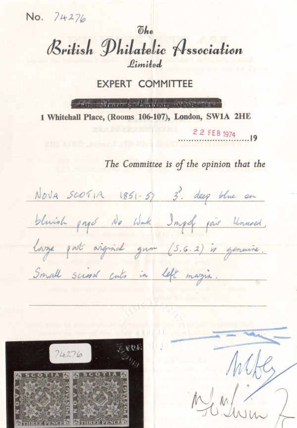 Nova Scotia #2 Extra fine mint pair, full original gum, hinged, bright color, certificate mentions small scissor cut at left... Read more